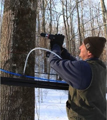 Mapleland Farms now has over 19,000+ taps. Although not as picturesque as the old-fashioned method of bucket collection, we rely on a maze of plastic tubing and collection tanks to capture the sweet sap of the sugar maple. This enables us to tap more trees and gather sap from remote sugar bushes more quickly.